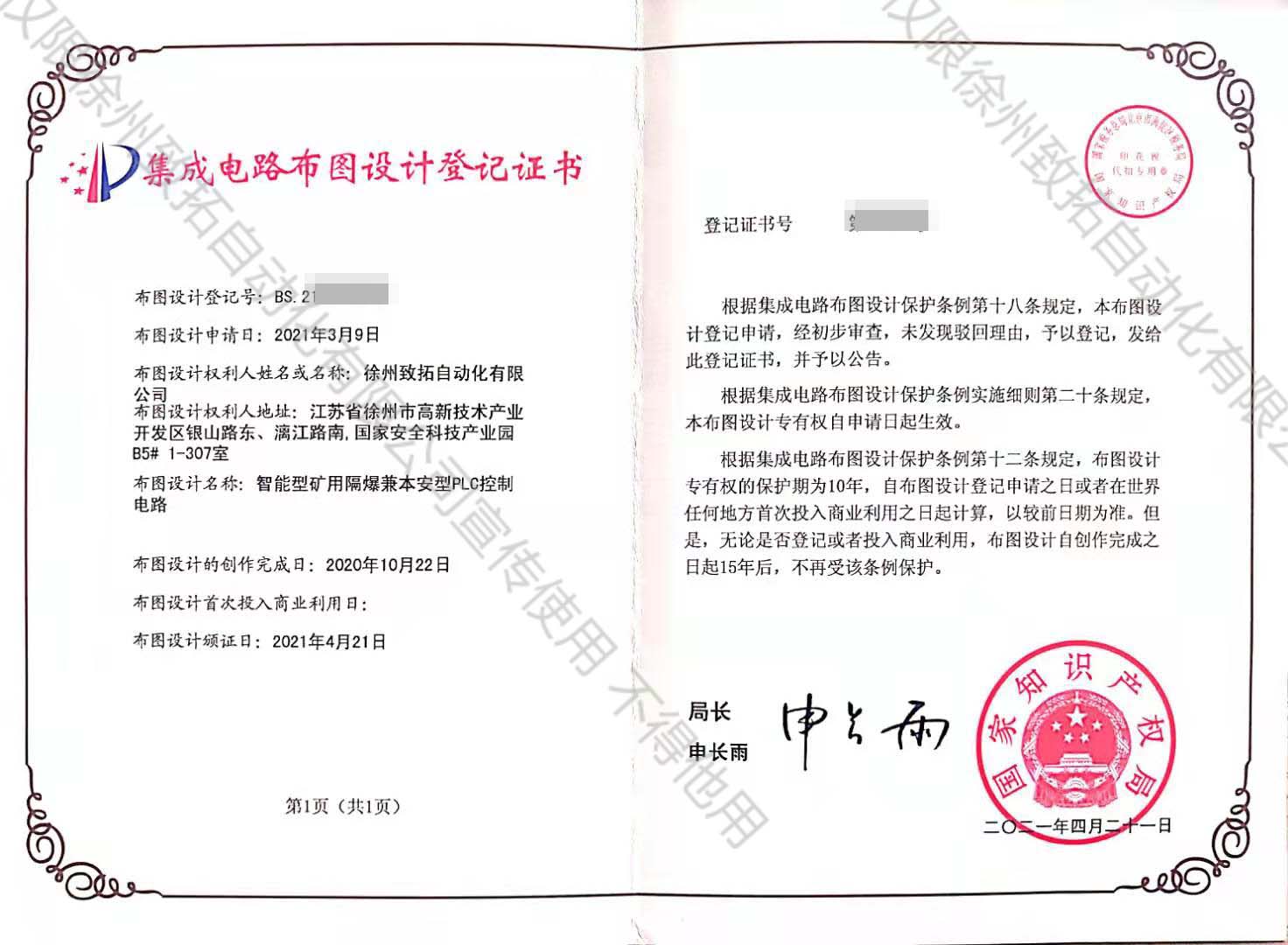 礦用隔爆兼本安型PLC控制電路設(shè)計(jì)登記證書(shū)